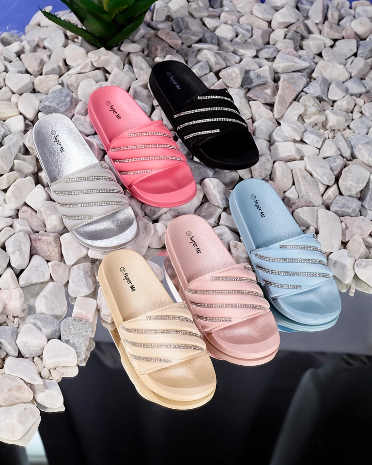• Красивые женские тапочки на плоской подошве, украшенные мелкими фианитами, стелька из резинового материала. Эта красивая пара обязательно должна быть в вашем чемодане во время отпуска!