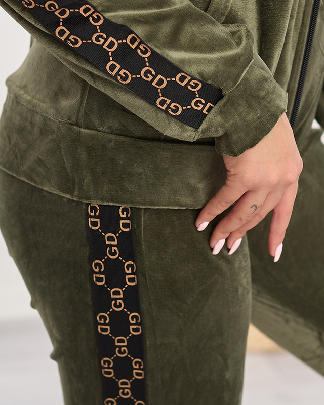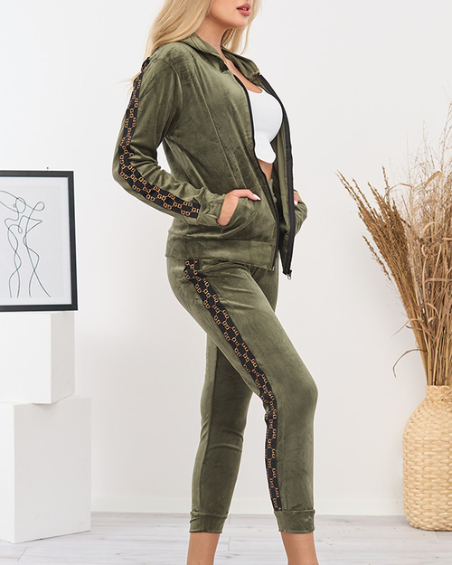 - Модный женский свитшот из материала а-ля велюр. Толстовка застегивается на молнию, имеет капюшон и два кармана. Брюки с эластичным поясом и накладными карманами спереди. Изделие украшено полосками. ПРИМЕЧАНИЕ: Точность измерения (+/-) 1 см.