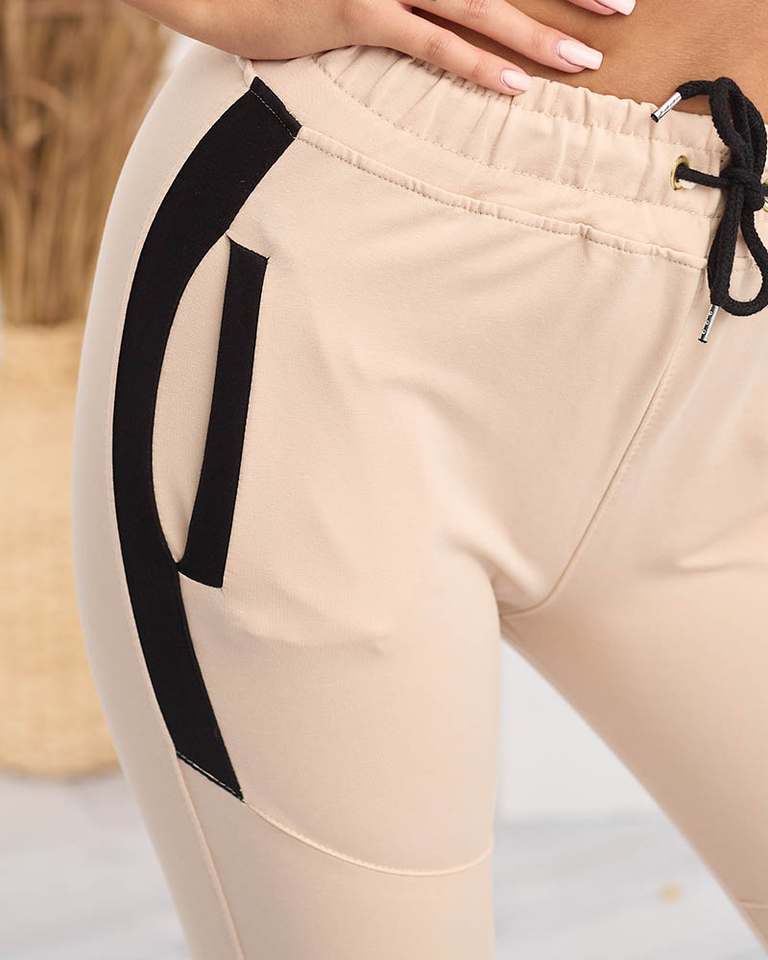 • Женские спортивные штаны из мягкой хлопчатобумажной ткани. Модель имеет резинку и завязки на талии. Брюки с 2 накладными карманами, декоративными вставками и штанинами на резинке. ПРИМЕЧАНИЕ: Точность измерения (+/-) 1 см.