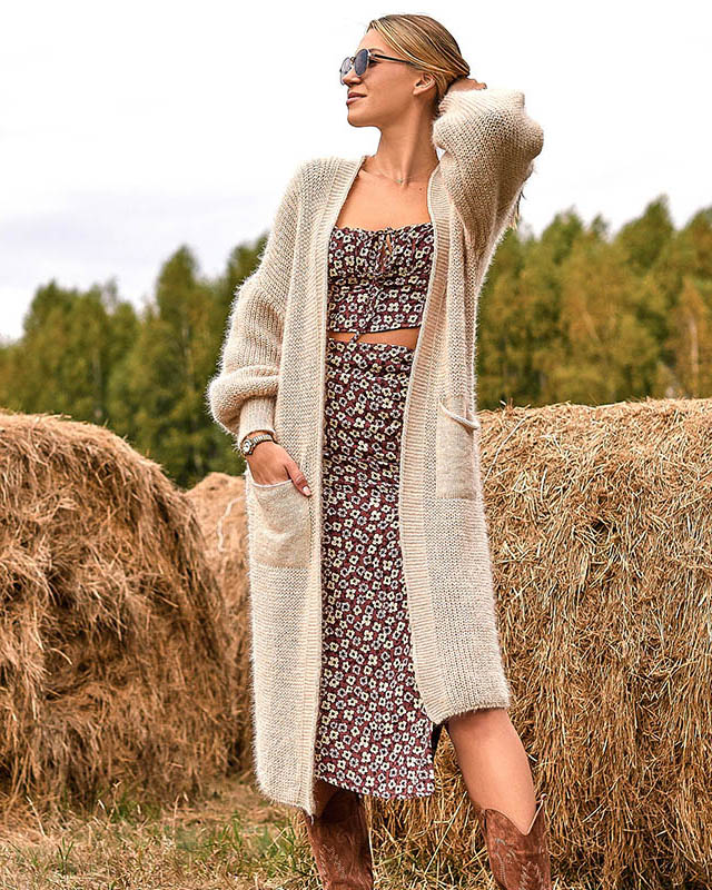 - Женский длинный кардиган из приятного на ощупь полиэстера. Кардиган имеет два накладных кармана по бокам. Идеальный элемент вашего гардероба, который дополнит ваши осенние наряды! ПРИМЕЧАНИЕ: Точность измерения (+/-) 1 см.