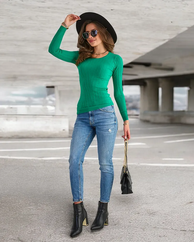 Зеленый женский свитер с круглым вырезом