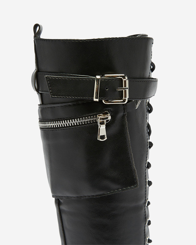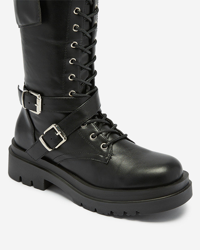 • Черные рабочие ботинки до середины икры с декоративными полосками по верху. Модель выполнена из экокожи. Стелька из ткани. Имеют молнию и дополнительные шнурки. Идеально для осенних дней! ЧЕРНЫЕ ЖЕНСКИЕ БОТИНКИ ИМИЕЛИН