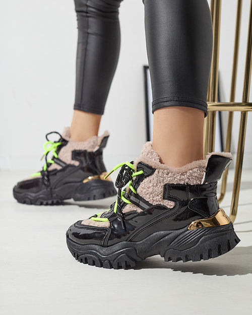 Черные женские спортивные кроссовки с мехом и неоново-желтыми шнурками Adbo- Footwear