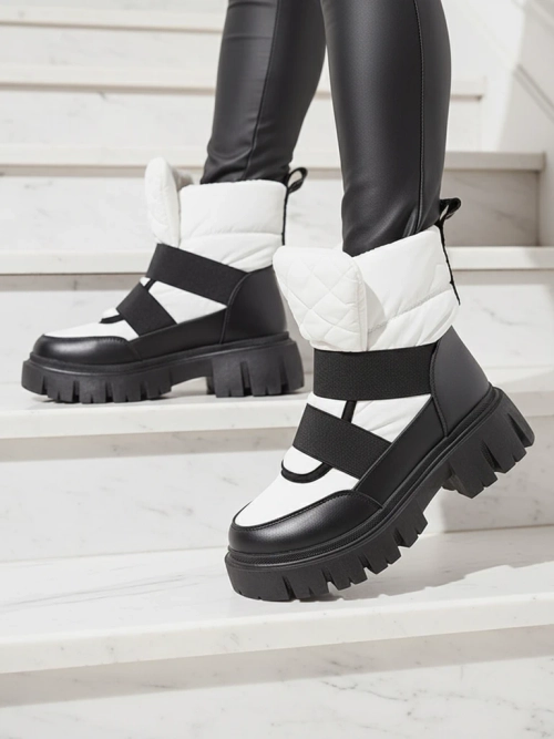 - Сенсационные женские сноубутсы на толстой подошве - верх выполнен из пластика а'ля масленка, середина утеплена мехом. Модель имеет резинку в верхней части. БЕЛЫЕ И ЧЕРНЫЕ ЖЕНСКИЕ СНЕЖНЫЕ САПОГИ, УТЕПЛЕННЫЕ МЕХОМ