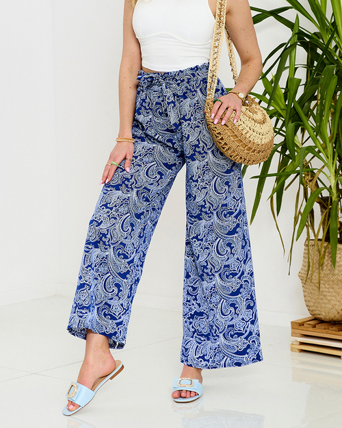 Темно-синие женские брюки из ткани с принтом - Одежда