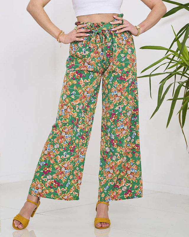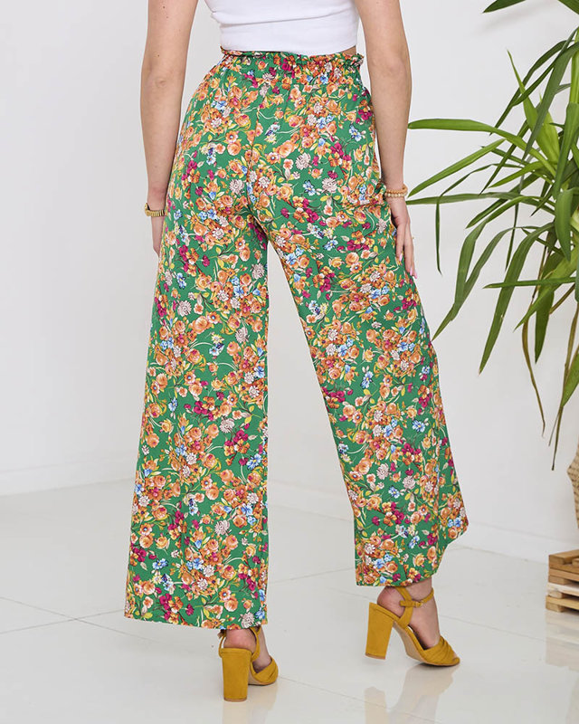 Женские зеленые брюки-палаццо с оранжевыми цветами - Одежда