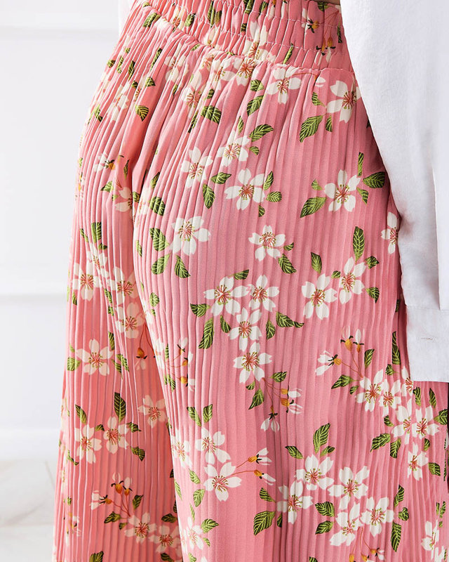 Женские розовые брюки из ткани с цветочным узором - Одежда