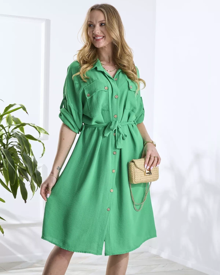 Зеленое женское платье а'ля рубашка с завязками на талии - Одежда