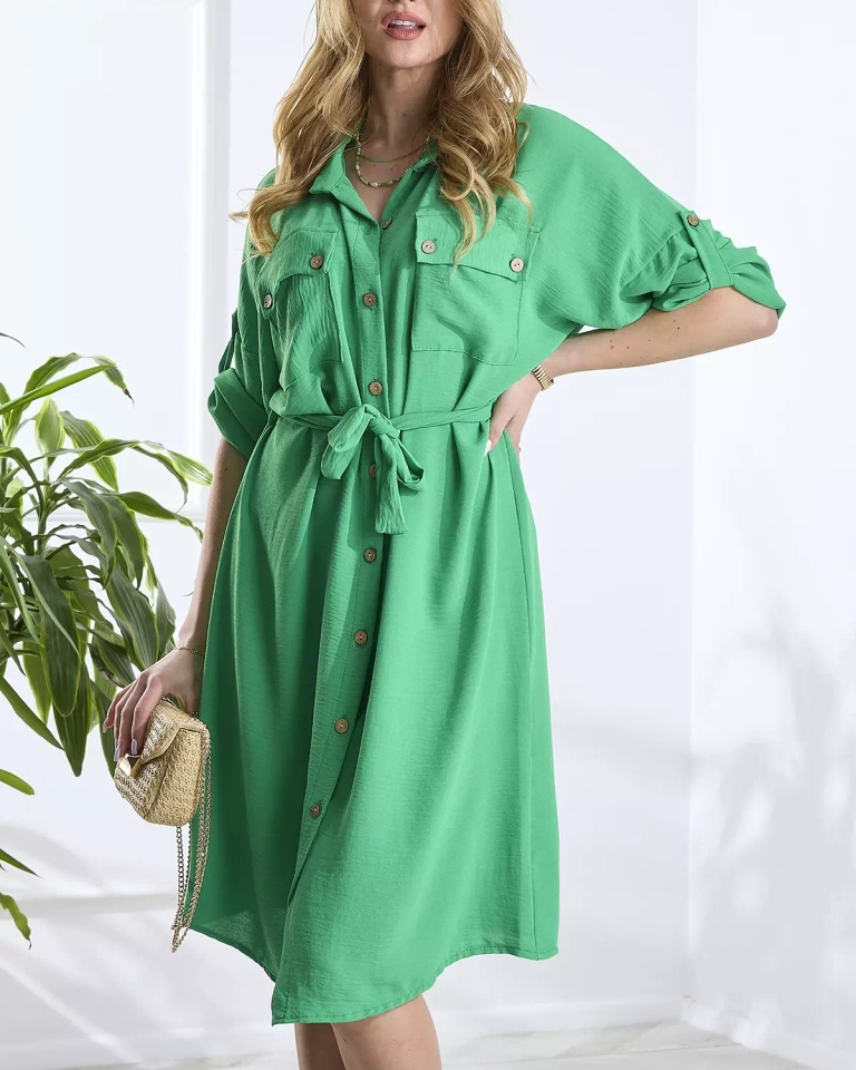 - Женское платье а'ля рубашка, выполненное из мягкой ткани на молнии. Модель с воротником и двумя карманами, имеет длинные рукава с возможностью закатывания. На талии имеется завязка, идеально подчеркивающая талию. ПРИМЕЧАНИЕ: Точность измерения (+/-) 1 см.
