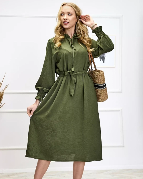 Женское длинное платье с завязками на талии оливкового цвета - Одежда