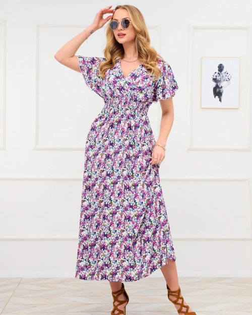 • Красивое женское платье длины макси. Модель имеет короткие рукава, вырез-конверт и эластичный пояс. Мягкая, приятная ткань покрыта цветочным узором. Идеально подходит для создания стильного наряда!