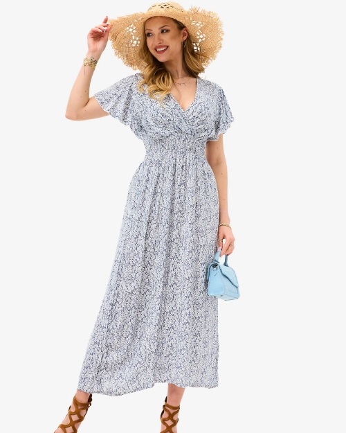 • Красивое женское платье длины миди, выполненное из мягкой цветочной ткани. Изделие с вырезом-конвертом, имеет короткие рукава и широкую резинку, подчеркивающую талию. Прекрасная основа для многих летних нарядов! ПРИМЕЧАНИЕ: Точность измерения (+/-) 1 см.