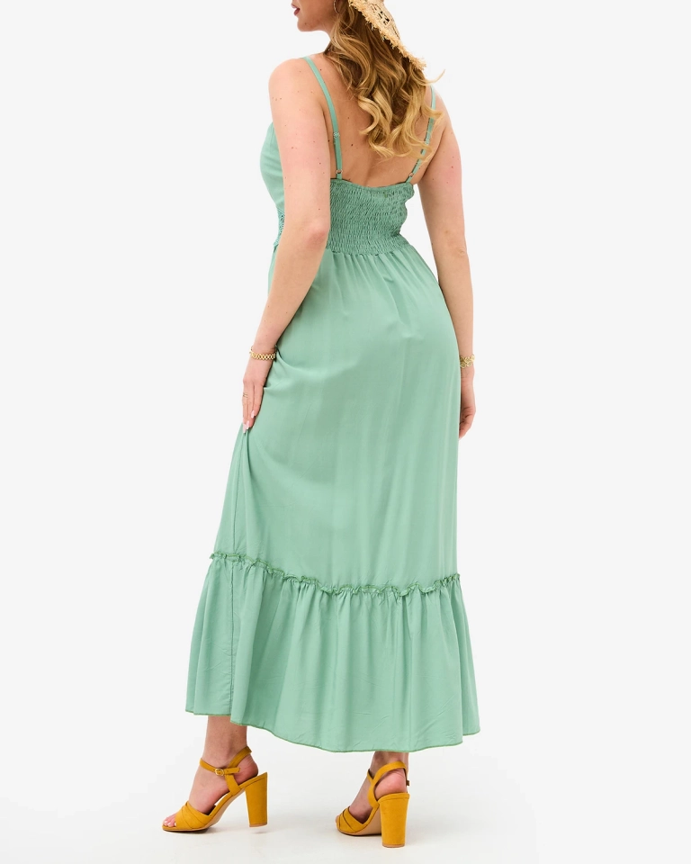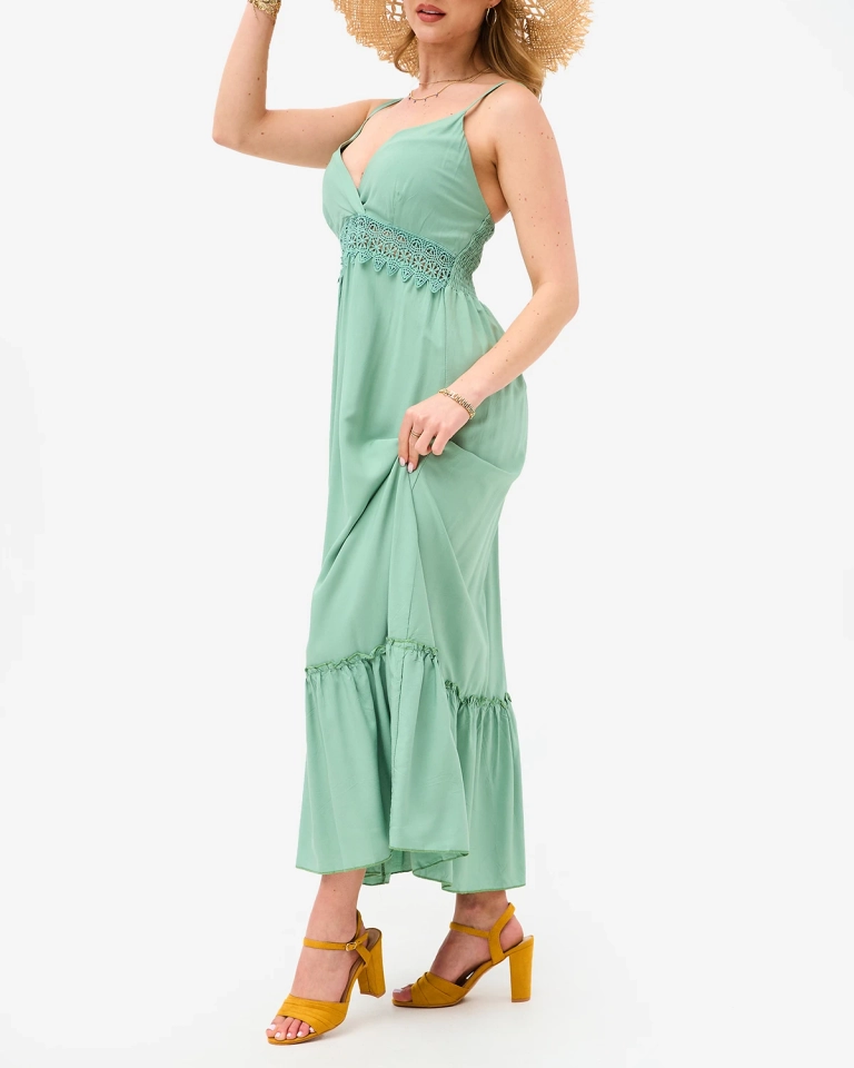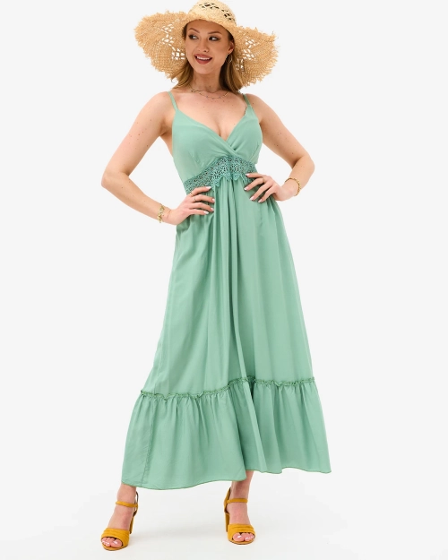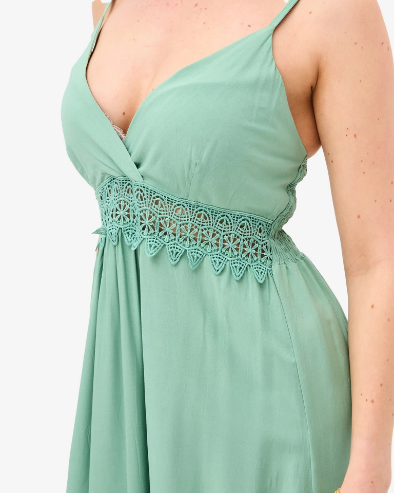 - Нежное женское платье длины миди, выполненное из приятной ткани. Модель с V-образным вырезом, на тонких, регулируемых бретелях, с резинкой и кружевной вставкой на талии. Идеально подходит для отпуска! ПРИМЕЧАНИЕ: Точность измерения (+/-) 1 см.