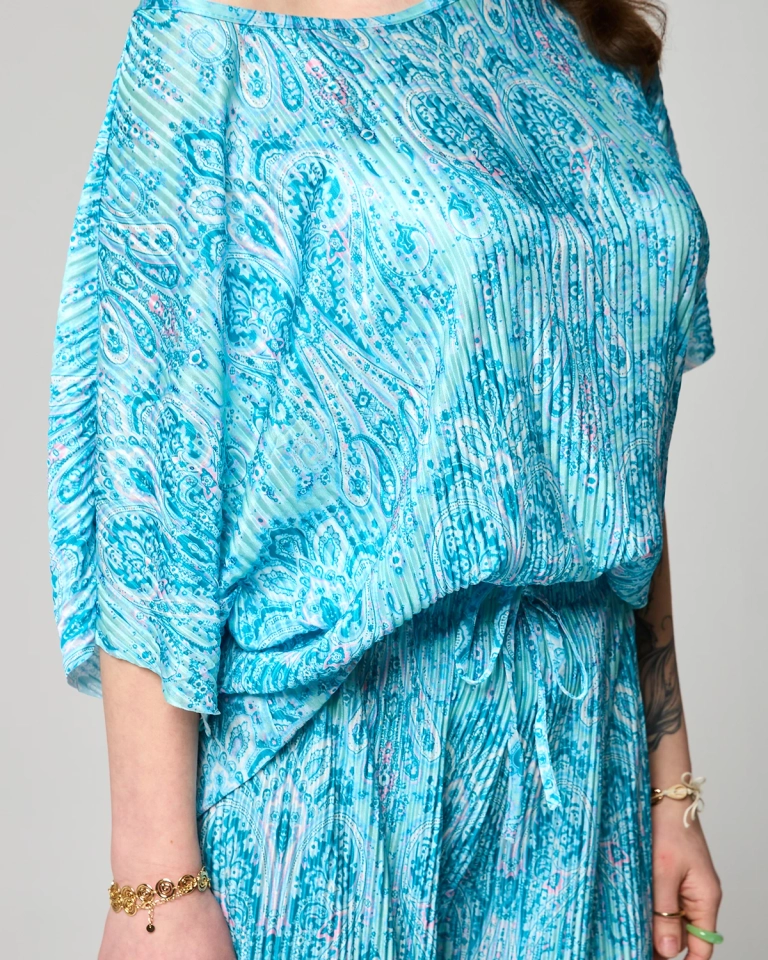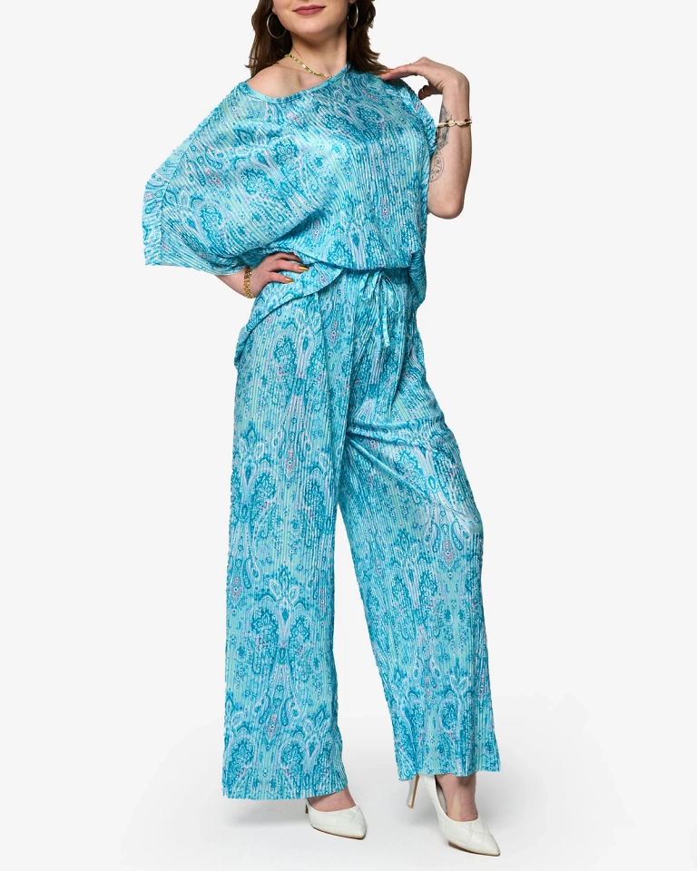 - Женский комплект из эластичной ребристой ткани. Блузка с короткими рукавами и круглым вырезом. Длинные брюки-палаццо с высокой талией, эластичным поясом и завязками на талии. Весь комплект украшен восточным принтом! ПРИМЕЧАНИЕ: Точность измерения (+/-) 1