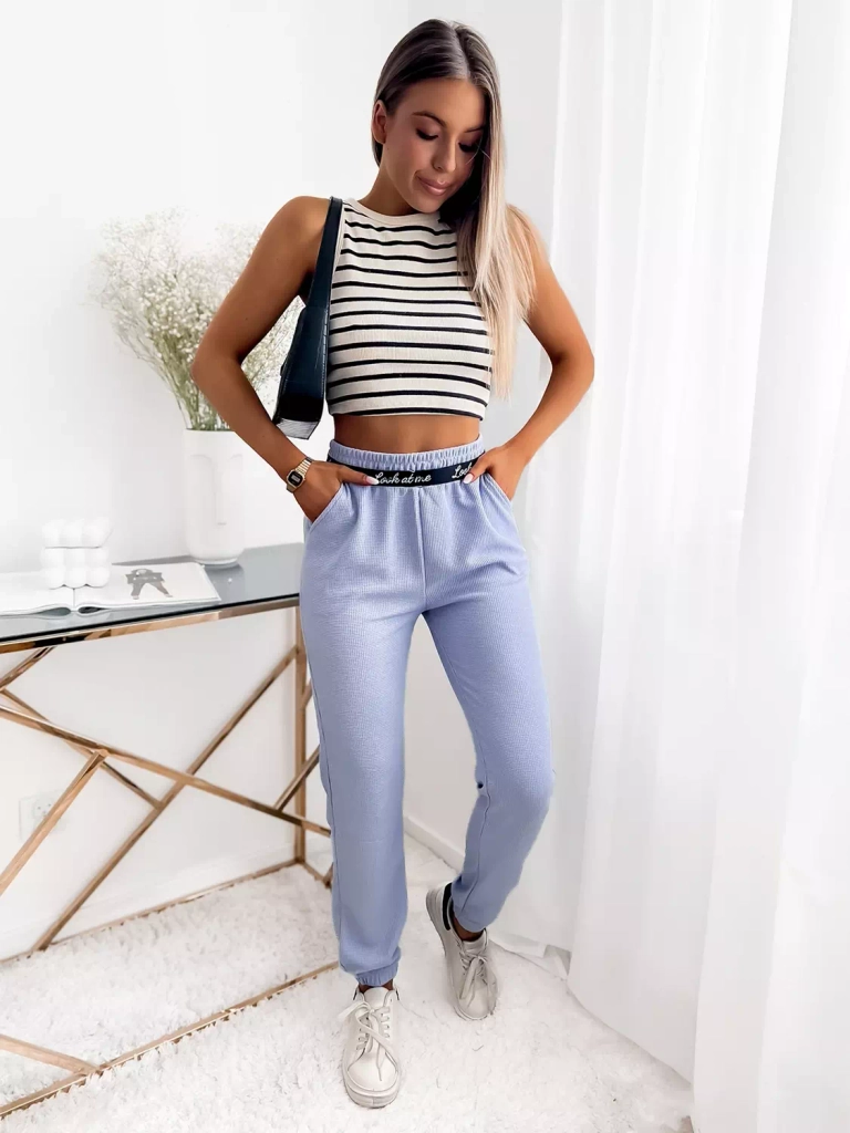 - Женские брюки из ткани, выполненные из хлопкового материала. Модель имеет эластичный пояс, 2 прорезных кармана и эластичный шнурок по низу ног. К брюкам прилагается резинка для регулировки брюк на талии. ПРИМЕЧАНИЕ: Точность измерения (+/-) 1 см.