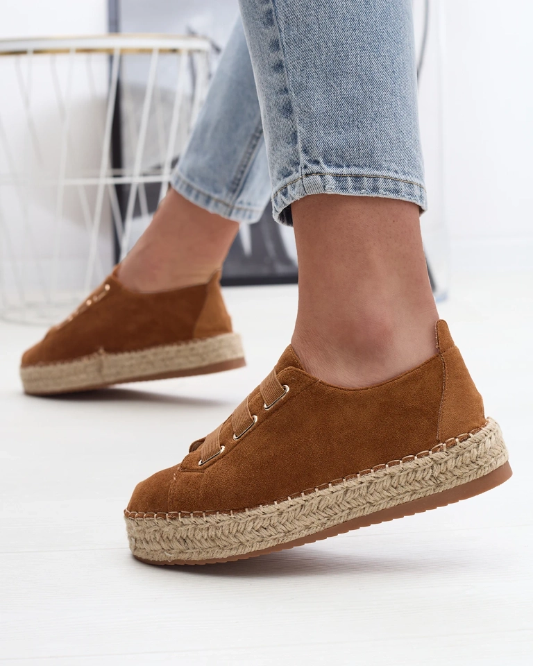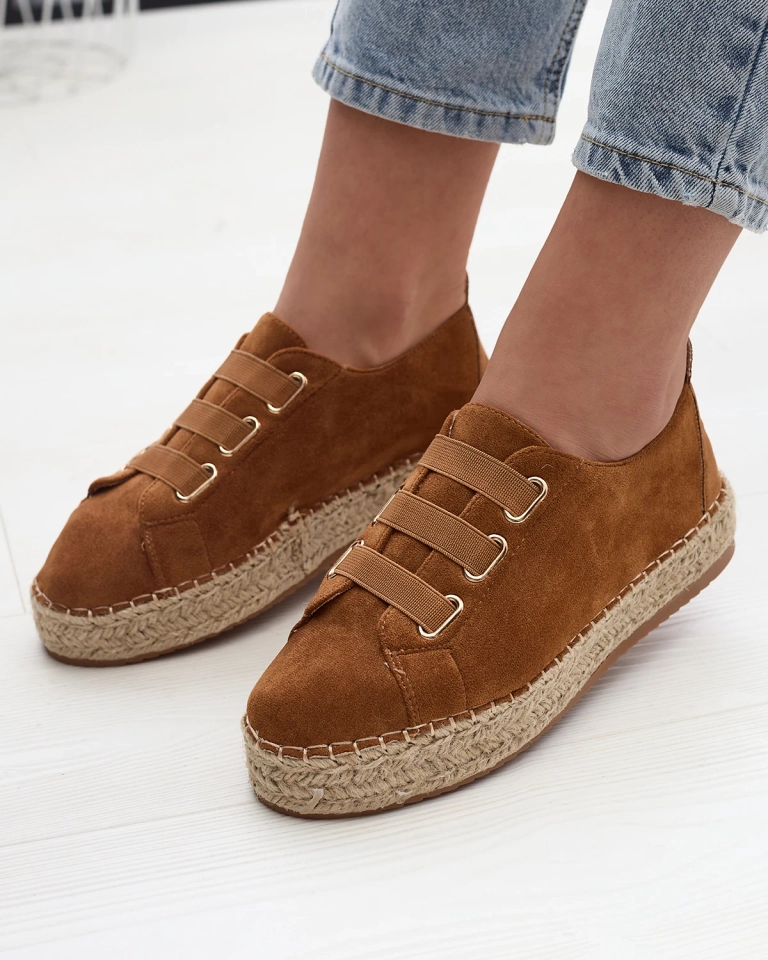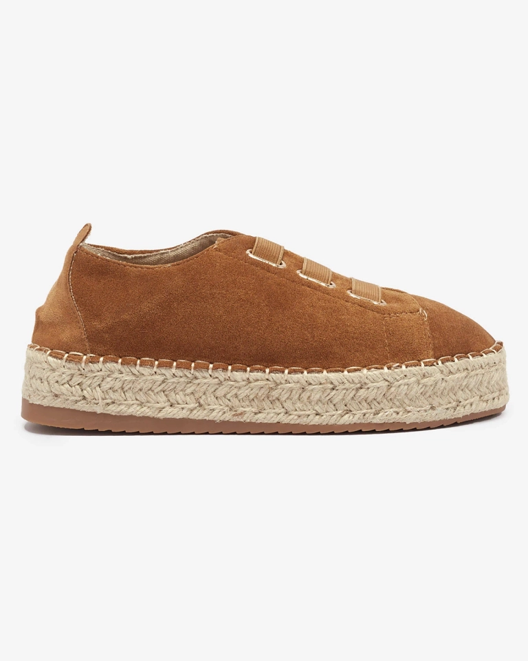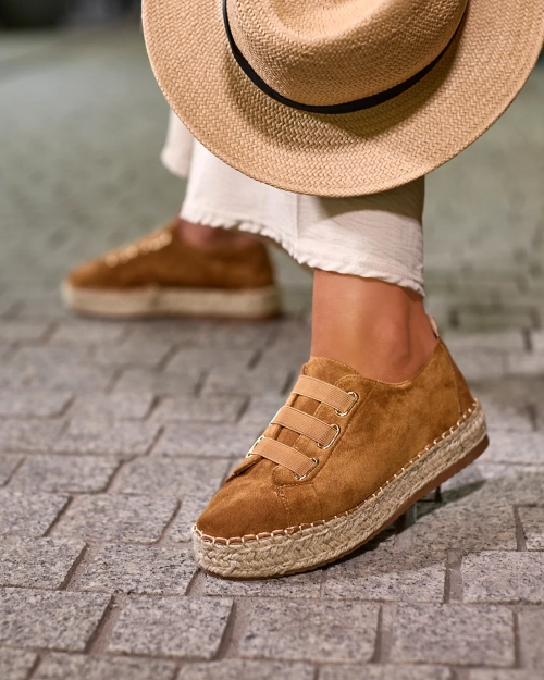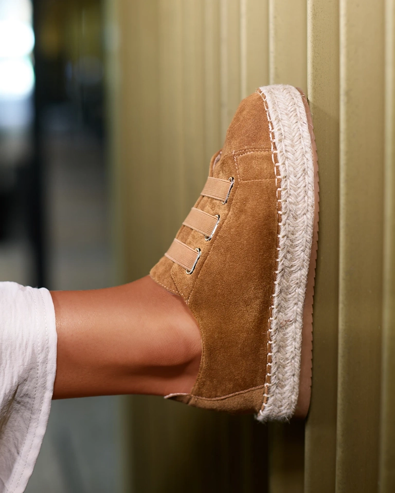 - Женские спортивные кроссовки на плоской подошве, выполненные из органической замши. Вместо шнурков - резинки, стелька из ткани, а подошва украшена джутовым шнуром. Носите их с широкими брюками и рубашкой!