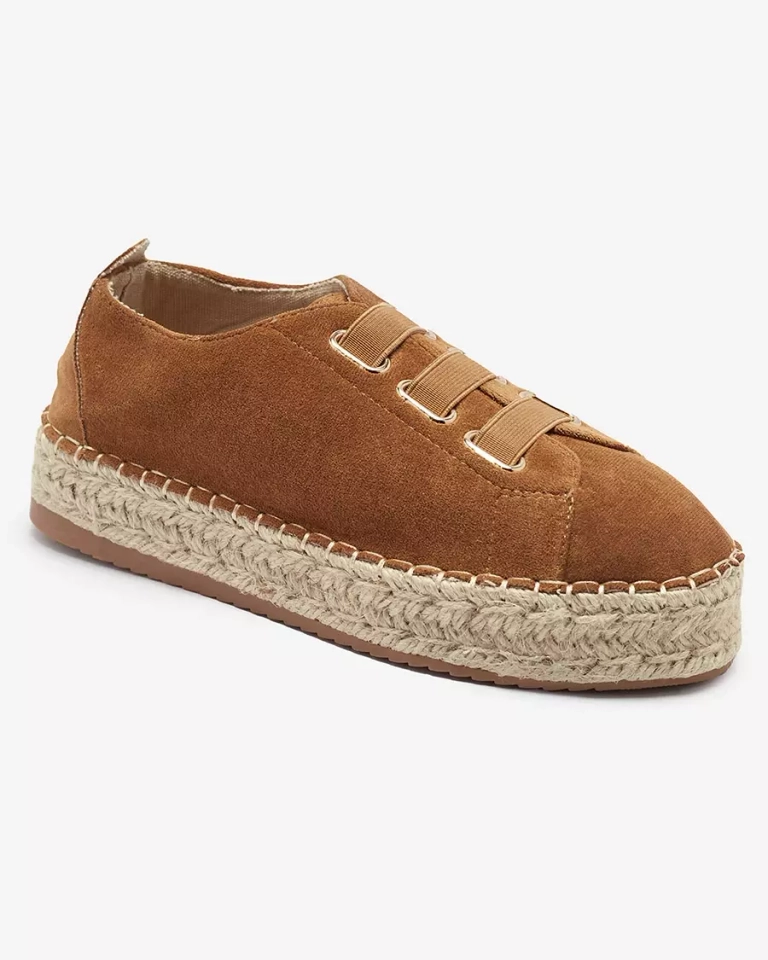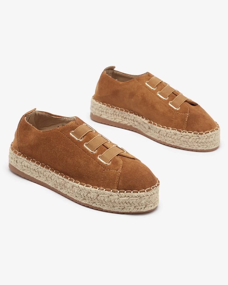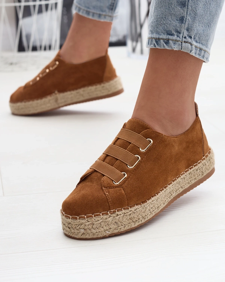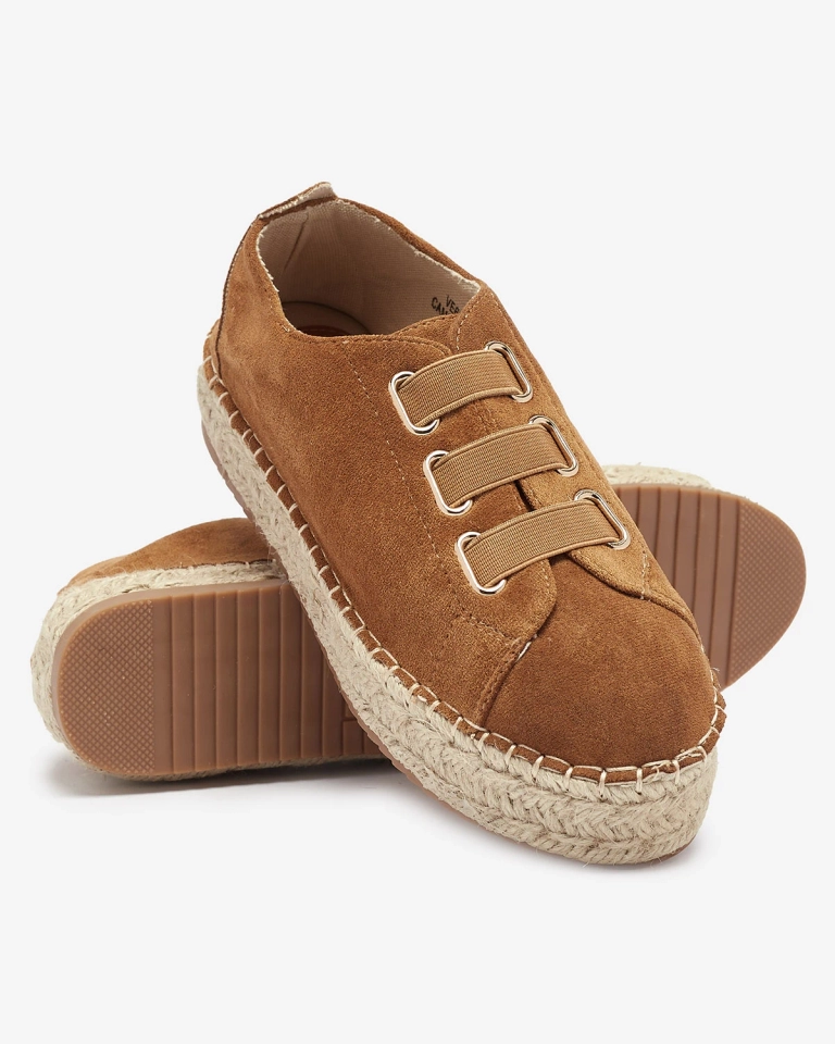 - Женские спортивные кроссовки на плоской подошве, выполненные из органической замши. Вместо шнурков - резинки, стелька из ткани, а подошва украшена джутовым шнуром. Носите их с широкими брюками и рубашкой!
