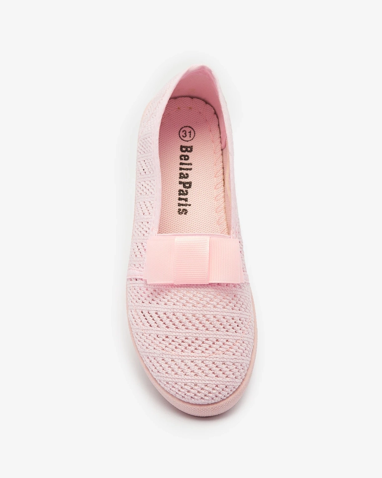 - Красивые кеды-слипы для девочек. Верх выполнен из ажурного тканевого материала, стелька также тканевая. Пара украшена очаровательным бантиком спереди. Кроме того, кроссовки имеют резиновую вставку для легкого скольжения ноги в обуви.