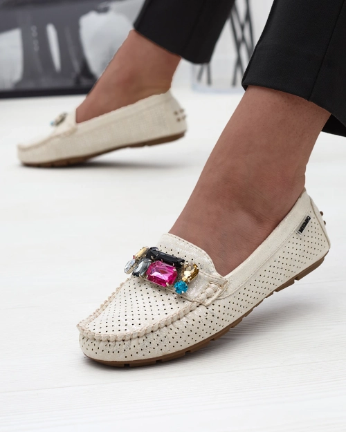 Кремовые женские ажурные мокасины с разноцветным декором Aqitic - Обувь