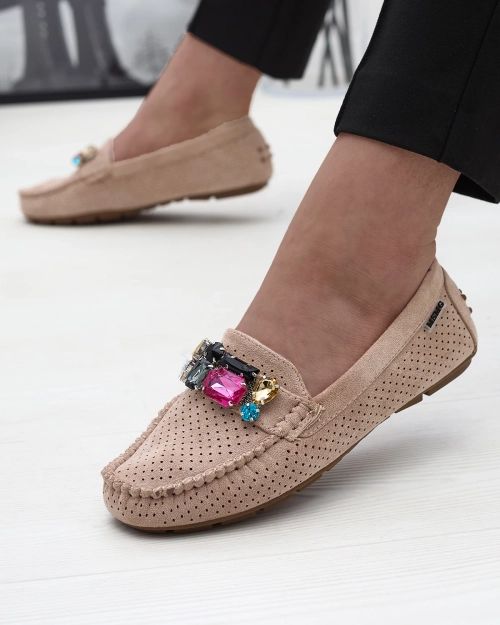 Светло-коричневые женские ажурные мокасины с разноцветным декором Aqitic - Обувь