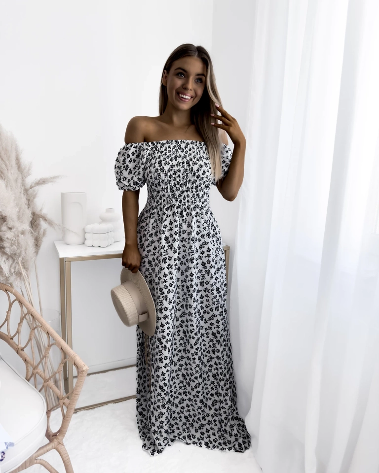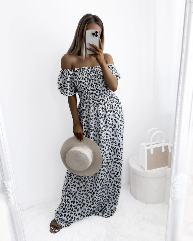 - Отличное женское длинное платье из легкой ткани, украшенное цветочным узором. Модель с круглым вырезом а'ля шишпанка, имеет короткие рукава и эластичную резинку на ширине бюста и талии. Must have этого сезона! ПРИМЕЧАНИЕ: Точность измерения (+/-) 1 см.