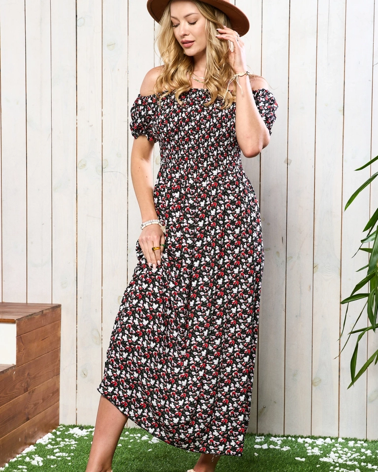 • Модное женское платье с открытыми плечами a'la hiszpana. Модель выполнена из легкой, воздушной цветочной ткани. На высоте бюста широкая, тянущаяся резинка. Изделие длины миди имеет короткие рукава. ПРИМЕЧАНИЕ: Точность измерения (+/-) 1 см
