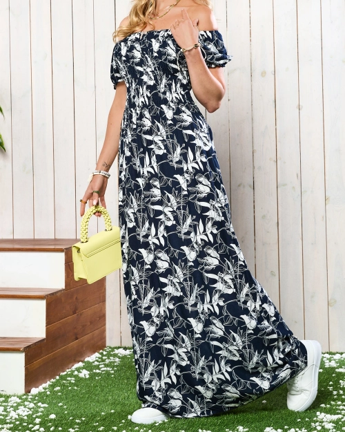 Темно-синее и белое женское платье-макси с принтом - Одежда