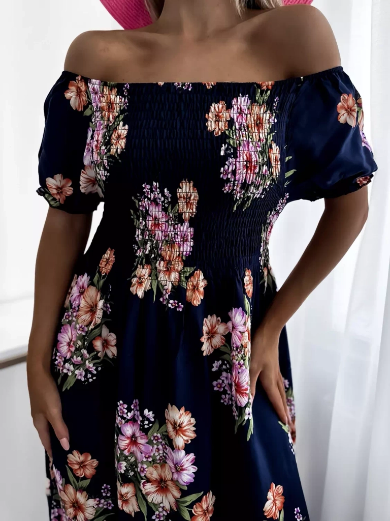 - Гармоничное женское платье миди длины с цветочным узором. Модель с короткими рукавами, имеет широкую резинку на бюсте. Изделие выполнено из легкой хлопково-полиэстеровой ткани. Идеальный вариант для лета! ПРИМЕЧАНИЕ: Точность измерения (+/-) 1 см.
