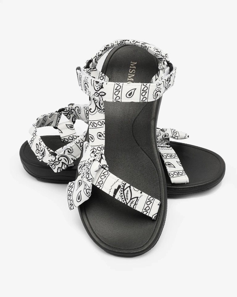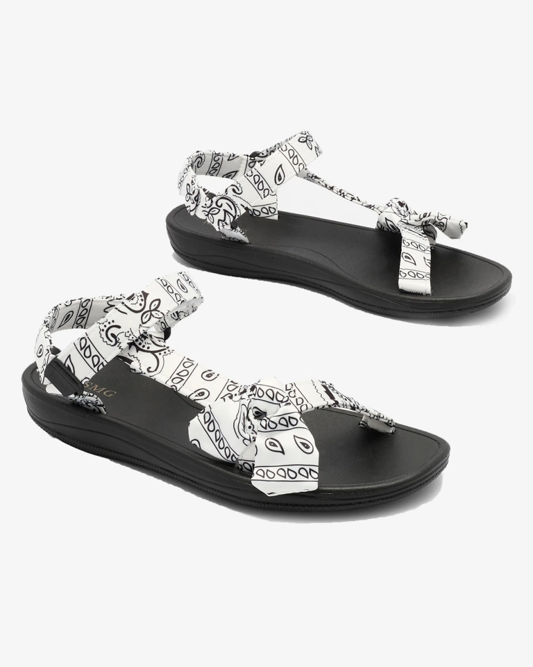 - Спортивные женские сандалии на резиновой подошве. Ремешки выполнены из тканевого материала с принтом и украшены бантиком. Представленная женская обувь застегивается с помощью ремешков на липучках. Они хорошо прилегают к ноге!
