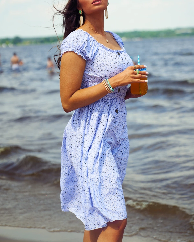 - Женское короткое платье с принтом из хлопковой ткани. Модель с круглым вырезом а'ля шишпанка и эластичной резинкой на талии. Модель с короткими рукавами. Подходит как под сандалии, так и под кроссовки! ПРИМЕЧАНИЕ: Точность измерения (+/-) 1 см.