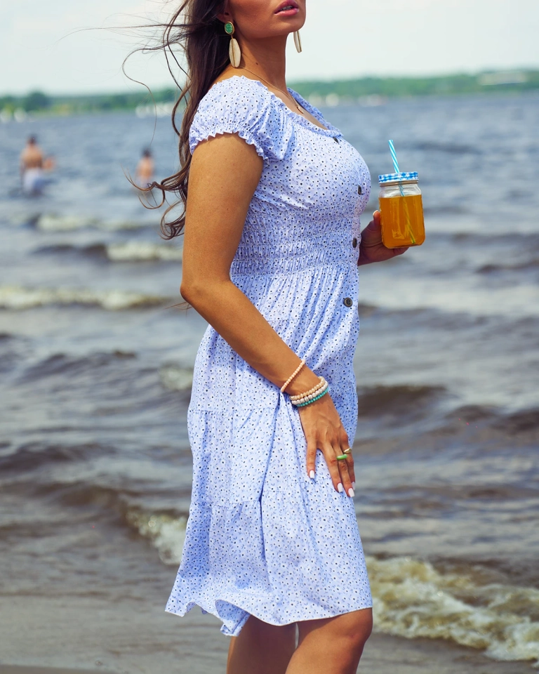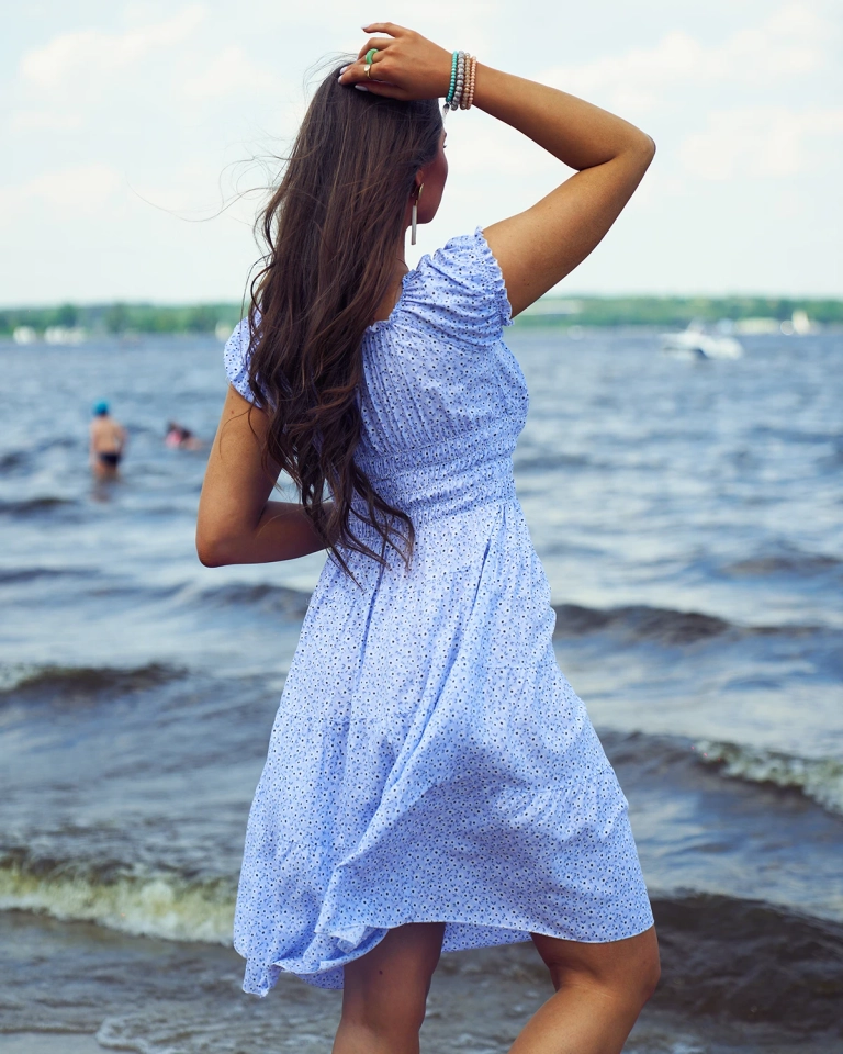 - Женское короткое платье с принтом из хлопковой ткани. Модель с круглым вырезом а'ля шишпанка и эластичной резинкой на талии. Модель с короткими рукавами. Подходит как под сандалии, так и под кроссовки! ПРИМЕЧАНИЕ: Точность измерения (+/-) 1 см.