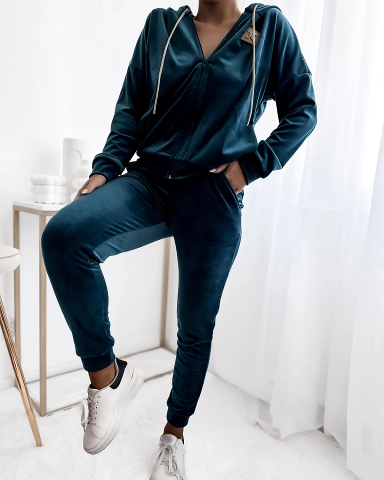 • Женский комплект толстовок из мягкого материала а'ля велюр. Толстовка украшена нашивкой, имеет капюшон, завязки на штанинах и 2 кармана. Брюки с широким эластичным поясом и 2 накладными карманами. ПРИМЕЧАНИЕ: Точность измерения (+/-) 1 см.