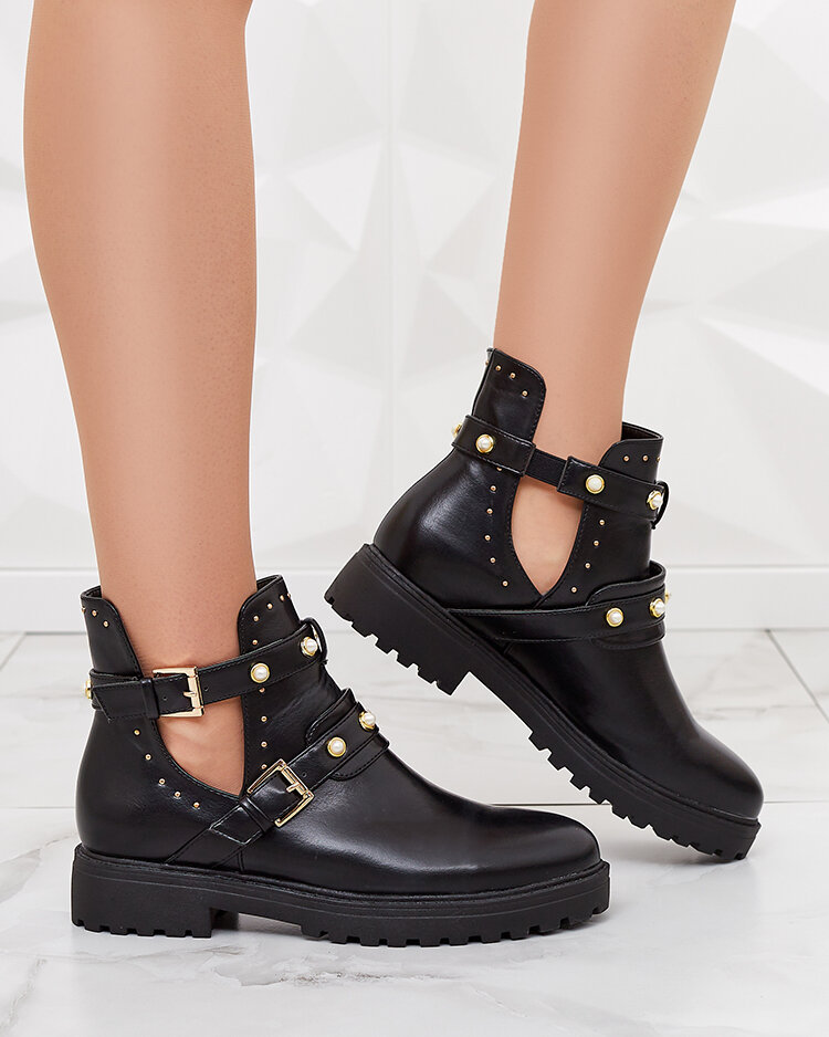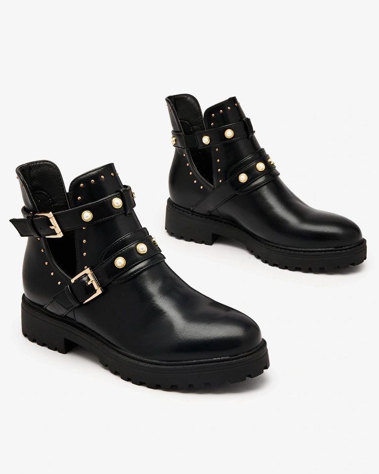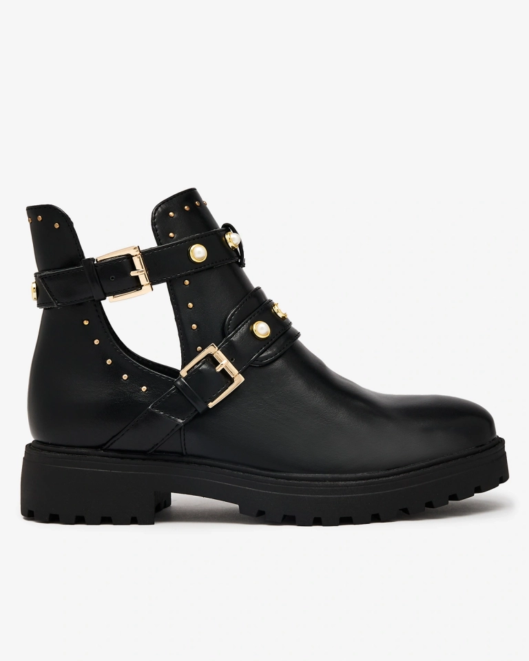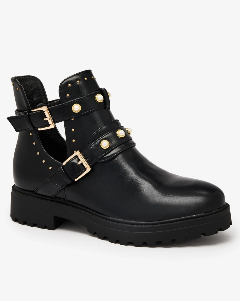 - Стильные женские черные сапоги на плоском каблуке. Верх с модными вырезами выполнен из экокожи. Внутри стелька из эко-кожи. Пара украшена стразами и жемчугом и застегивается на пряжки по бокам.