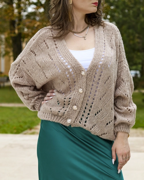 Royalfashion Светло-коричневый короткий расстегнутый свитер с золотыми пуговицами