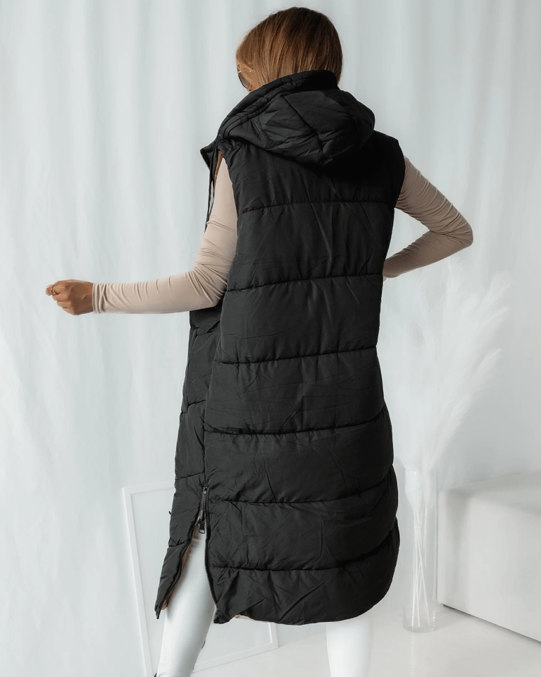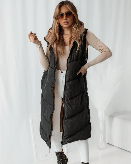 • Суперстильный длинный двусторонний женский жилет со стеганой отделкой - идеальный вариант для осеннего сезона. Безрукавка застегивается на молнию, имеет капюшон, четыре накладных кармана. Модель в стиле casual имеет разрезы по бокам, застегивающиеся на мо
