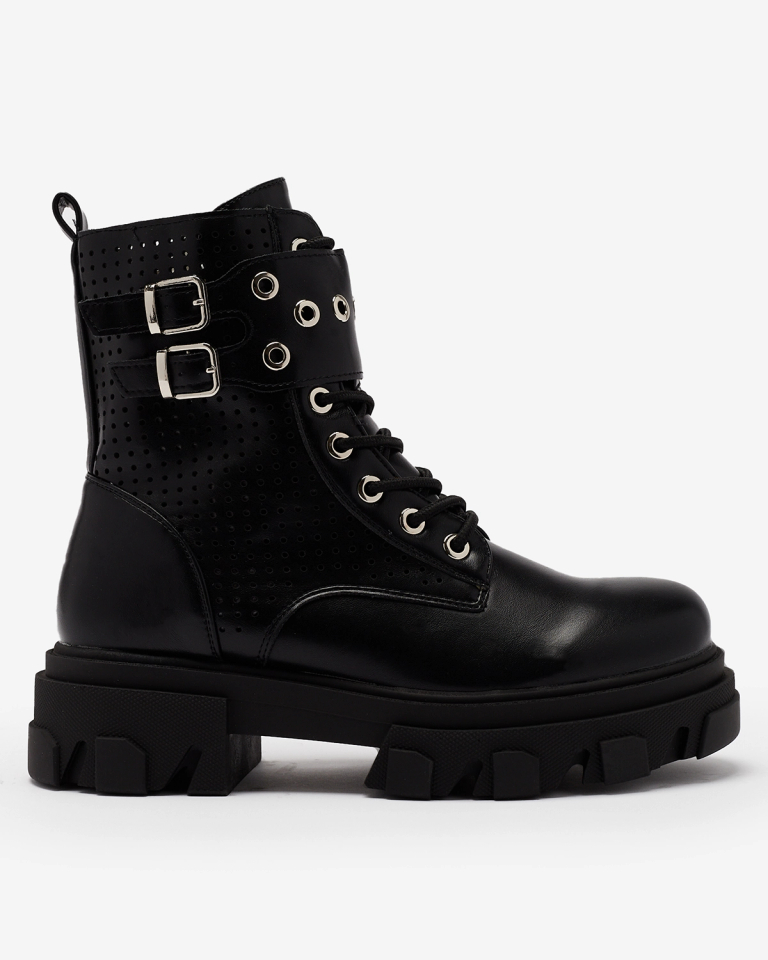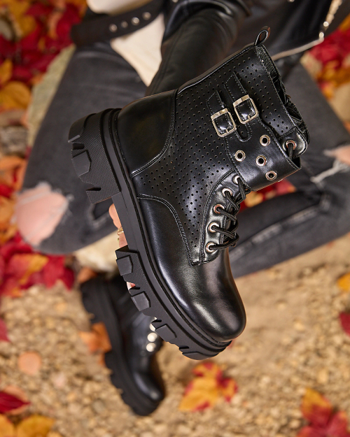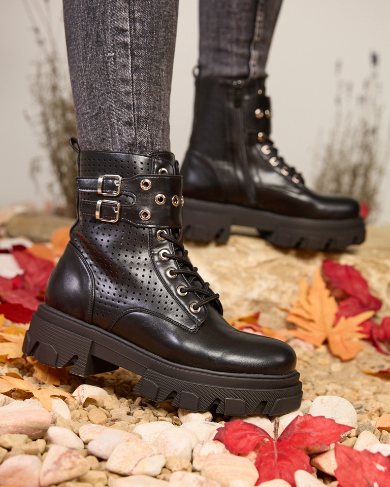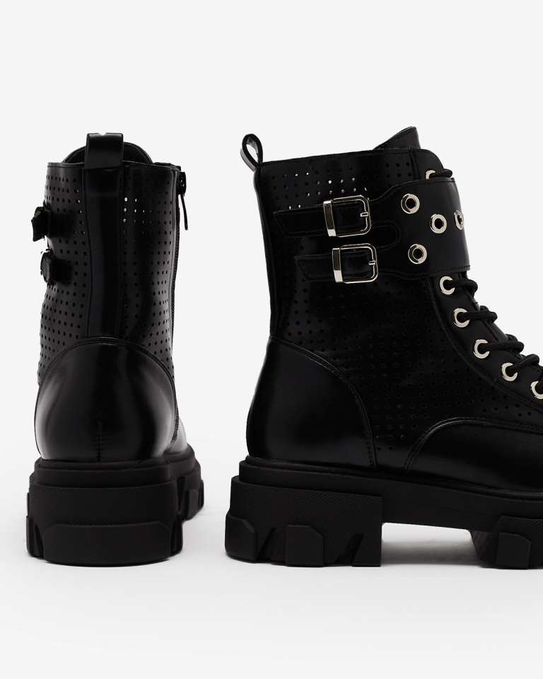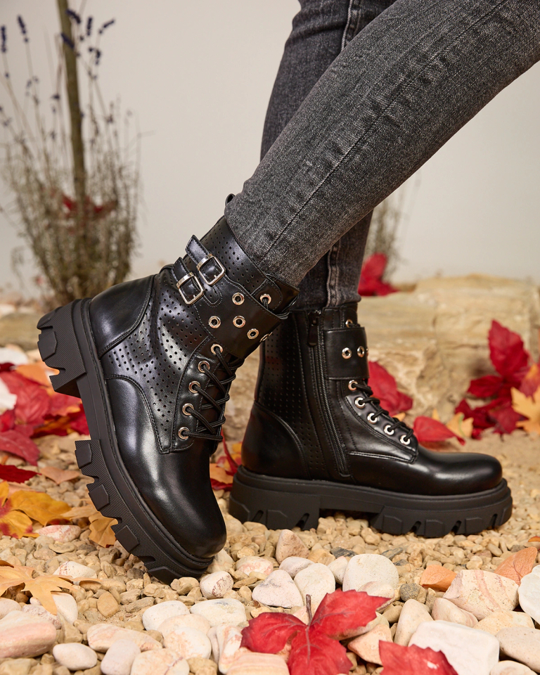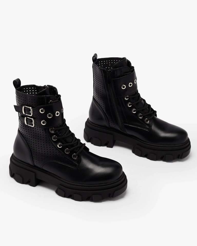 - Стильные ботинки-багги, полностью выполненные из экокожи. Ботинки застегиваются на шнуровку и молнию, имеют толстую резиновую подошву и ажурную отделку. Идеальный вариант для осени!