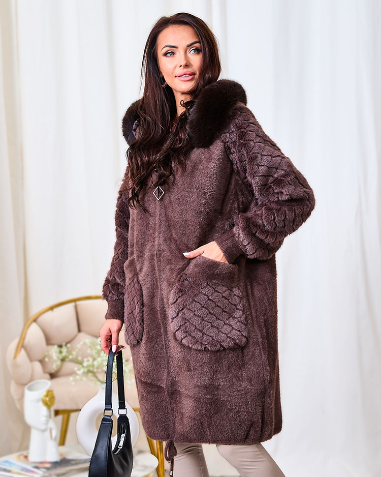 - Женское пальто с имитацией меха имеет длинные рукава и классический крой, позволяющий адаптировать его к фигуре. Модель на молнии имеет отстегивающийся капюшон, два кармана и ребристый подол по низу.