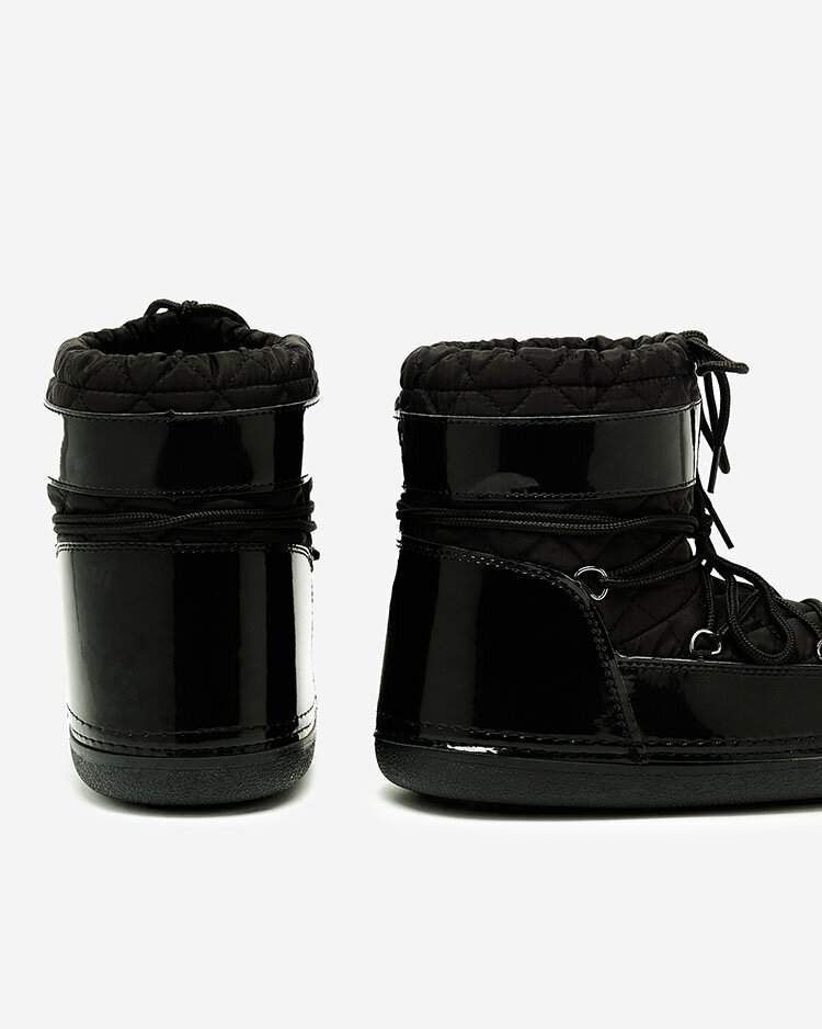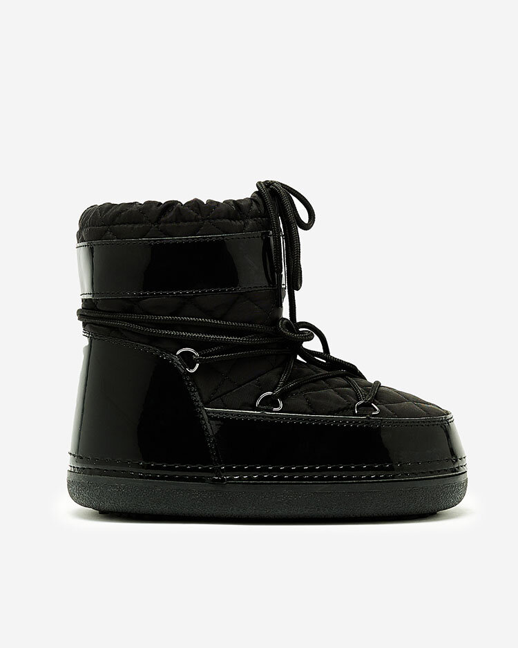 - Женские сапоги со стелькой, верх которых выполнен из комбинации эко-лакированной кожи и стеганого тканевого материала. Подкладка из ткани внутри, обувь на шнуровке и без нее имеет ремешок.