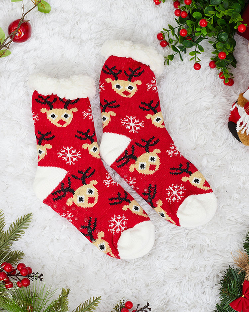 - Красивые женские толстые носки, отделанные рождественским рисунком с нескользящим низом. Внутри утеплены белой теплой овчиной. Носки отлично подойдут для холодных вечеров.