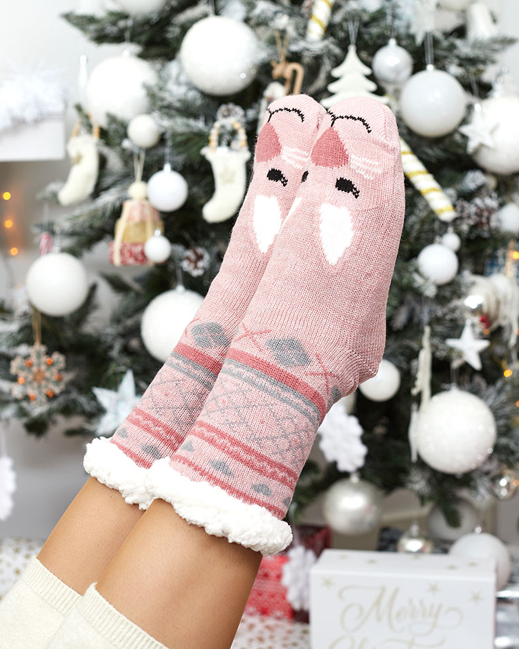 - Красивые женские толстые носки, отделанные рождественским рисунком с нескользящим низом. Внутри утеплены белой теплой овчиной. Носки отлично подойдут для холодных вечеров.