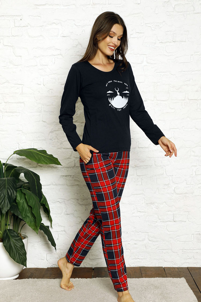 - Женская пижама из хлопковой ткани. Модель украшена принтом, брюки в клетку. Прекрасный подарок к Рождеству! ПРИМЕЧАНИЕ: Точность измерения (+/-) 1 см.