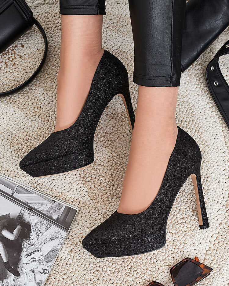 - Сенсационные женские туфли на шпильке, имеют верх из экокожи с глиттером. Стелька выстлана экокожей, модель на высокой шпильке с заостренным носом. Идеальны для коротких платьев!