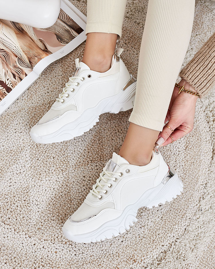 • Женские спортивные кроссовки из эко-кожи. Внутри имеется тканевая стелька. Модель на шнуровке, на сплошной подошве с серебристой вставкой сзади. Станут отличным аксессуаром для повседневного стиля.