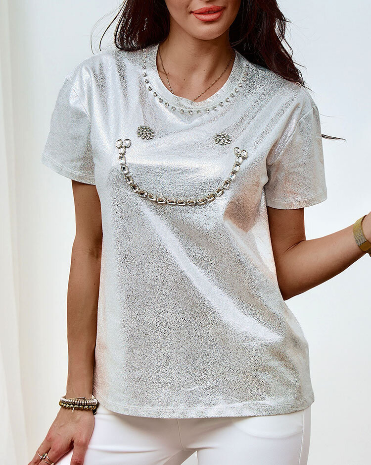 - Блестящая женская футболка с короткими рукавами. Изготовлена из хлопковой ткани. Модель украшена цирконами. Идеальная основа для многих повседневных образов! ПРИМЕЧАНИЕ: Точность измерения (+/-) 1 см. Размеры измерены в горизонтальном положении.