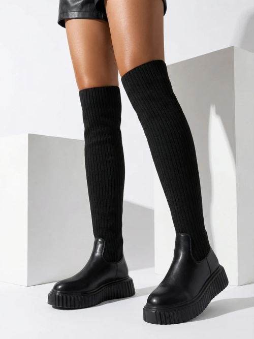 - Стильные женские сапоги по колено на толстой подошве. Верх выполнен из эластичного ребристого материала и имеет вставки из экокожи. Меховая стелька. Модель "слип-он".
