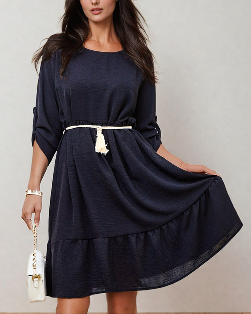 - Повседневное женское платье длиной до колена с длинными, закатанными рукавами и круглым вырезом. Плюс пояс в комплекте. Must have этого сезона! ПРИМЕЧАНИЕ: Точность измерения (+/-) 1 см. Размеры измерены в плоском виде.