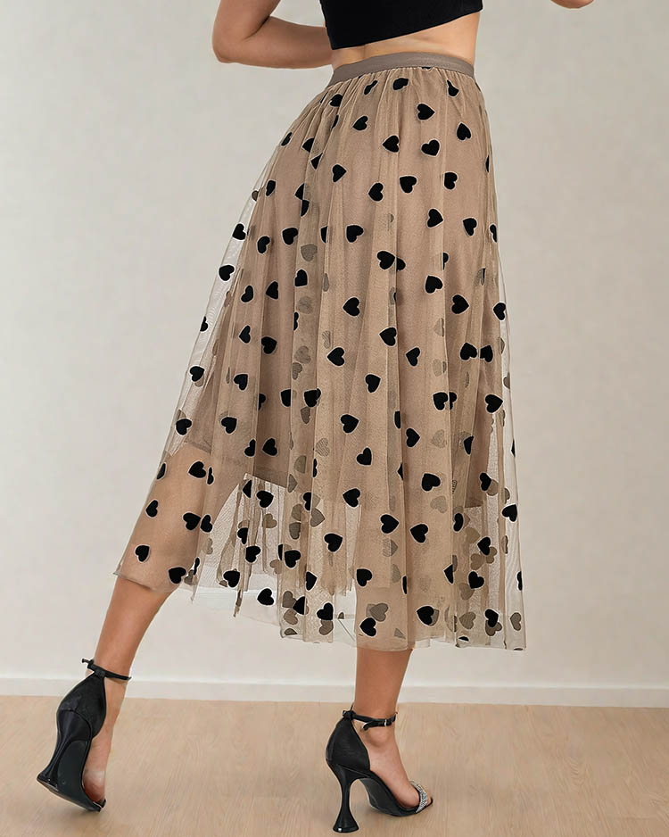 - Нестареющая женская двухслойная юбка-миди с сердечками. Модель имеет эластичный пояс, который идеально подчеркивает талию. Эта юбка станет отличным акцентом вашего повседневного образа!
