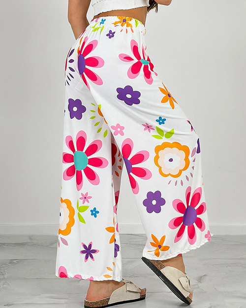 • Женские широкие брюки с цветочным узором. Модель со средней талией, с резинкой и завязками на талии, имеет карманы спереди. Мода и комфорт в одном!