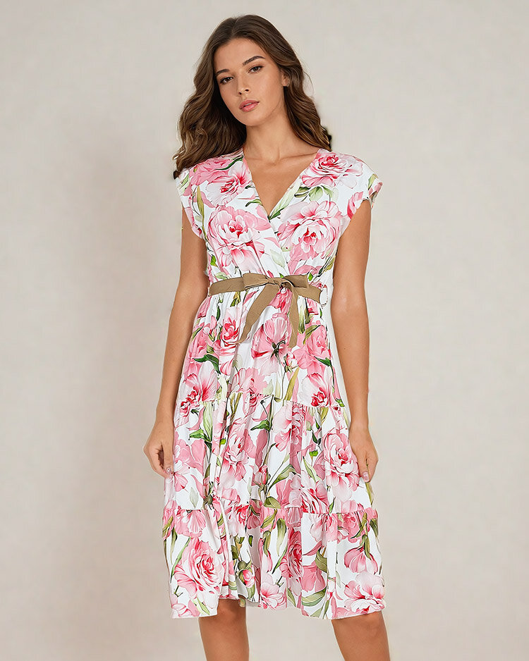 - Уникальное женское платье из легкой ткани с цветочным узором. На высоте талии оно имеет пояс. Изделие имеет длину миди, короткие рукава и отделку оборкой. Почувствуйте лето в этой модели!