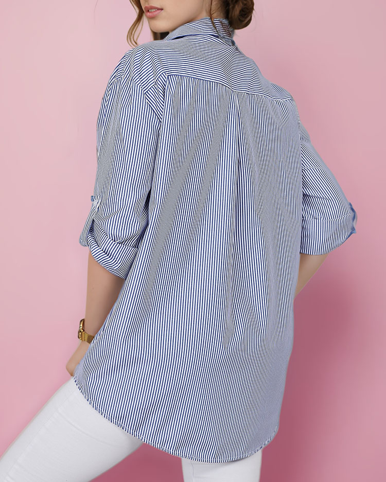 - Сенсационная женская рубашка в полоску с длинными рукавами. Модель с отложным воротником, застегивается на пуговицы. Обязательно должна быть в шкафу каждой женщины!